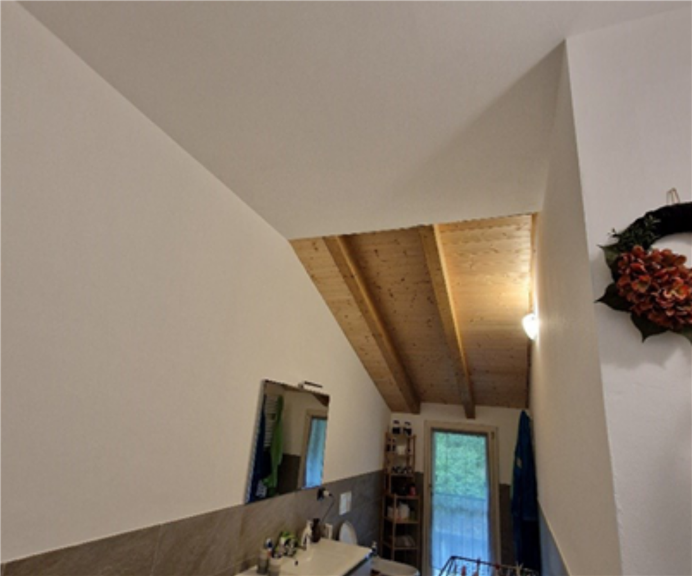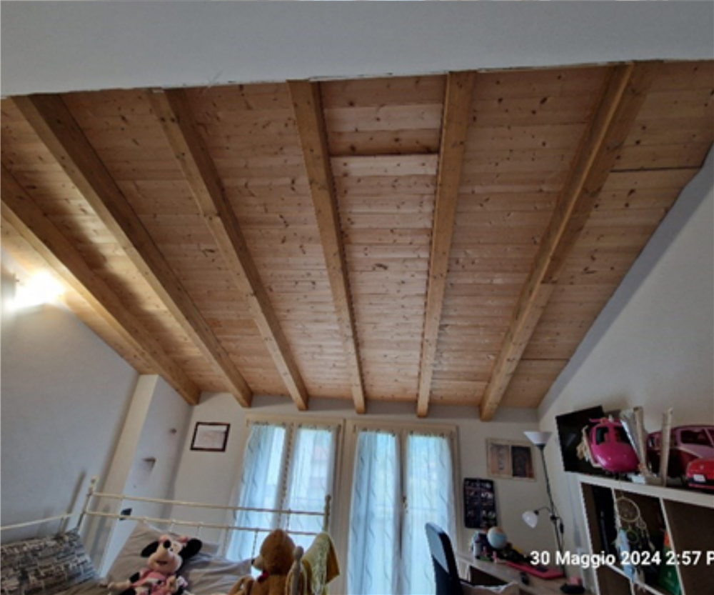 medio: pavimentazione in legno (piano terra e sottotetto) e rivestimenti in