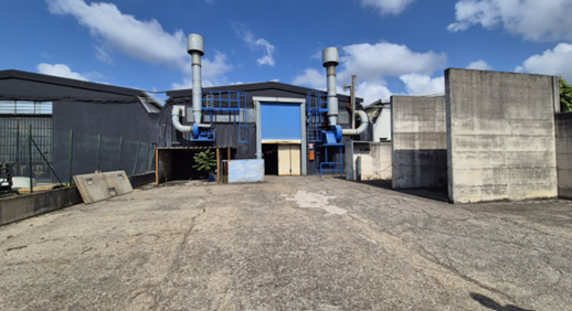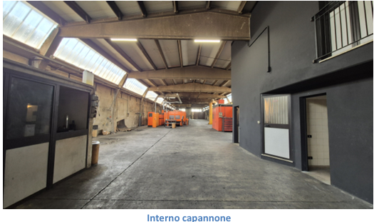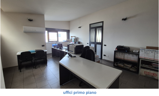 Capannone al piano terra con annessa area di pertinenza, della superficie coperta di circa mq1.100 e scoperta di circa mq 400 e, all’interno, struttura adibita ad uffici di circa mq 110(composta da 3 locali e bagno e sovrastanti 2 locali e altro bagno)